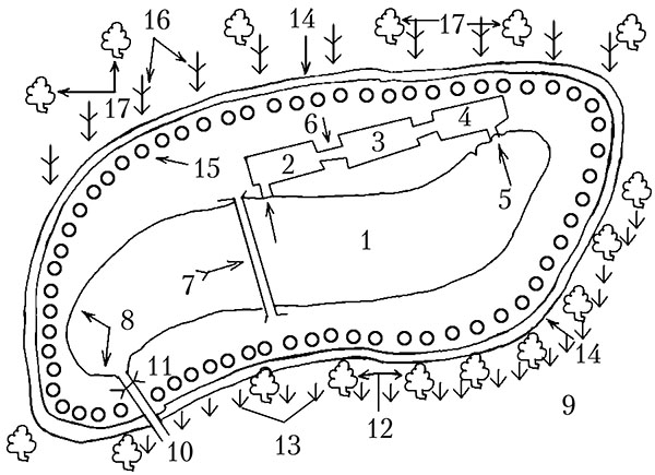Вариант расположения искусственного водоема на приусадебном (дачном) участке с родниковым водоснабжением: 1 – искусственный водоем; 2 – дафниевая яма глубиной 0,6 м; 3 – дафниевая яма глубиной 0,45 м; 4 – дафниевая яма глубиной 0,3 м; 5 – соединительные каналы между дафниевыми ямами и искусственным водоемом; 6 – соединительные каналы между дафниевыми ямами; 7 – мостик через искусственный водоем; 8 – подводная растительность; 9 – река (озеро); 10 – соединительный канал (труба) между искусственным водоемом и рекой (озером); 11 – решетка в канале, которая препятствует выходу рыбы из искусственного водоема; 12 – березовые насаждения; 13 – насаждение из лозы; 14 – защитный бруствер (земляной вал), предотвращающий попадание к водоему вредных веществ во время дождя или наводнения; 15 – цветник; 16 – плодово-ягодные кустарники; 17 – фруктовые деревья