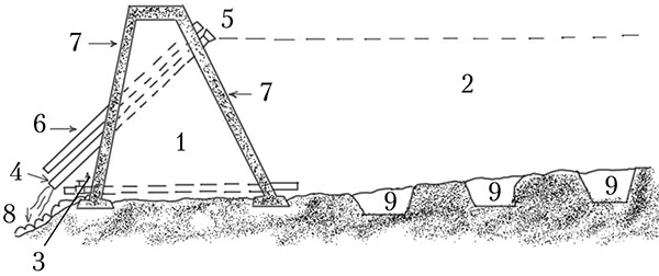 Устройство водослива в водоеме при слабом ручьевом водоснабжении: 1 – насыпная дамба; 2 – пруд; 3 – сливная труба с краном; 4 – переливная труба; 5 – сетка на переливной трубе; 6 – резервная переливная труба (переливные трубы можно установить горизонтально или под углом); 7 – забетонированная часть дамбы; 8 – булыжная отмостка, которая препятствует размыванию грунта; 9 – ямы для вылавливания рыбы при полном освобождении пруда от воды