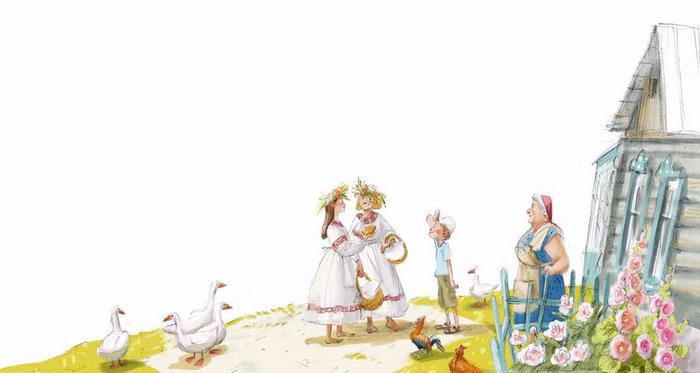 И вдруг… Я протёр глаза и чуть с изгороди не свалился. Две сказочные красавицы в белых рубахах с красными узорами и с венками из полевых цветов поднимались по просёлочной дороге. Они весело переговаривались, со смехом перепрыгивая через коровьи лепёшки.