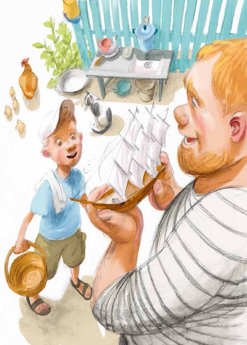 Судя по громким звукам падающей утвари и коробок, сосед основательно спрятал свой секрет. Когда я потерял всяческую надежду увидеть что-нибудь интересное, из сарая раздался радостный крик: «Нашёл!» И через минуту появился дядя Коля – весь в пыли и паутине. Улыбаясь во весь рот, он бережно держал в руках большой парусник. Затем резко дунул на корабль, дождался, когда серое облако пыли опять осело на палубу, и протянул мне.