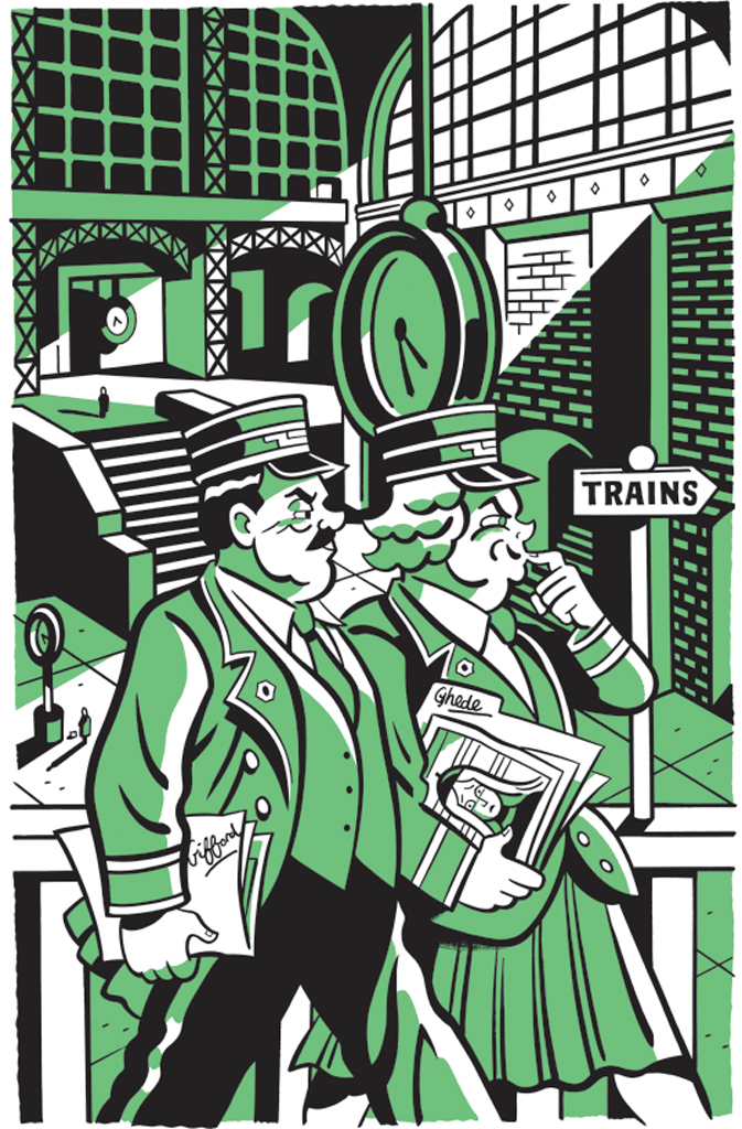 Stain’d Station was the busiest place I’d ever seen in town. The enormous room was thronging with people, and the noise of the crowd echoed up to the ceiling, which was lined with curved iron bars, like a black rainbow hanging in the loud air. Someone had lit torches that lined the walls, and by the flickering light I could see the train, twenty or thirty cars in length, at rest on one of the station’s many tracks. Most of the train’s cars were cargo cars, with INK INC. stamped on the sides and the tops open, to hold the ink extracted from octopi by enormous mechanized needles. But Ink Inc. was no longer a thriving business, and the octopi were scarcer and scarcer, so the cargo cars sat empty, ready to rattle through the fading town on tracks hardly used anymore. Behind the cargo cars were some passenger cars, decorated with wooden curlicues over the windows and old-fashioned railings bolted below and brightly painted designs everywhere else, and up front was a huge, tired engine, where people in black aprons hurried about with shovels and wheelbarrows, loading coal into the train’s tender. Porters in bright blue jackets helped the passengers push their way through the crowd, and conductors in gray suits punched people’s tickets with silver punchers clipped to their belts. Something was pinned to the lapels of their suits and jackets. I couldn’t see what it was, but I could hear the echo of each puncher’s click as it bounced off the ceilings, over and over again. Everyone seemed to be in a hurry to leave town.
