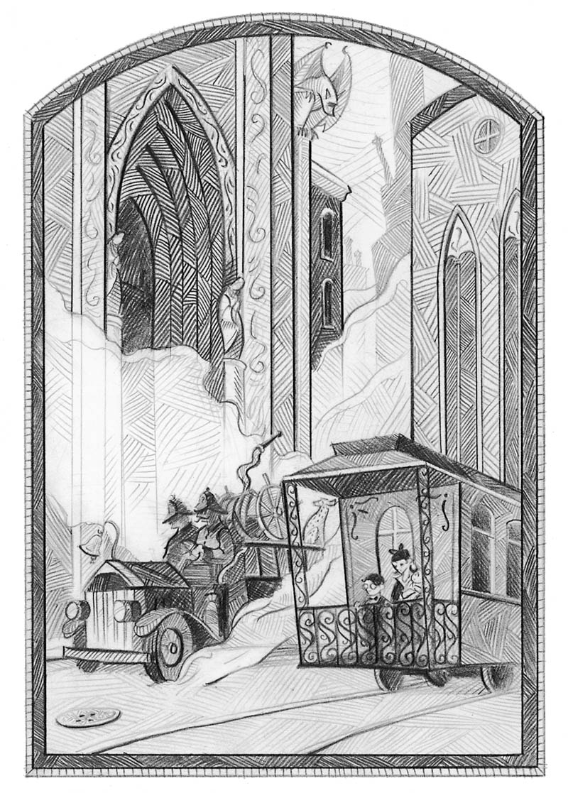 И дети покинули дом. Машина мистера По загрохотала по булыжной мостовой в сторону района, где жил Граф Олаф. Они проехали по аллее Уныния мимо экипажей, запряженных лошадьми. Мимо мотоциклистов. Мимо фонтана Каприз, искусно высеченного из камня сооружения, время от времени выплевывавшего воду, в которой плескались малыши. Они проехали мимо огромной груды земли, где раньше был Королевский парк. И вот уже мистер По свернул в узкий проулок, по обеим сторонам которого стояли домики из светлого кирпича, и остановился где-то на середине.