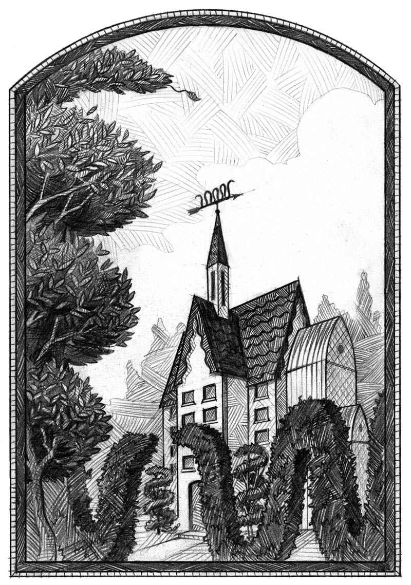 Мистер По свернул на крутую, посыпанную гравием подъездную дорогу, которая вела к огромному каменному дому. У дома была квадратная дверь темного дерева с несколькими колоннами по бокам. По обеим сторонам двери были вделаны лампы в форме факелов, которые ярко горели, несмотря на то что светило утреннее солнце. Над дверью в несколько рядов тянулись окна, и большинство из них были распахнуты. Самое удивительное находилось перед домом: громадная ухоженная лужайка с высокими, тонкими кустами причудливых очертаний. Когда машина мистера По остановилась, Бодлеры увидели, что кусты эти подстрижены в виде змей: змей длинных, змей коротких, змей с высунутыми языками, змей с открытыми ртами, обнажавшими зеленые, грозные зубы. Змеи были такими жуткими, что Вайолет, Клаус и Солнышко не сразу решились пройти мимо них в дом.