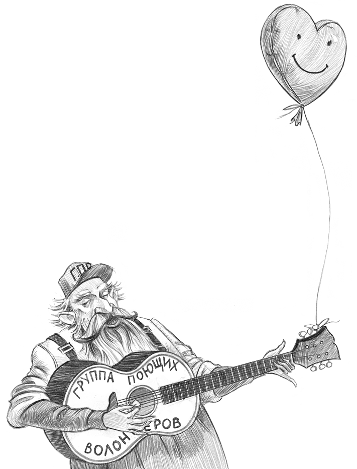 – Ух, какие мрачные! – сказал бородатый. – Ну ничего, не беспокойтесь. Где бы ваши родители сейчас ни находились, они наверняка довольны жизнью, так что долой хмурые лица. Быть жизнерадостным – вот смысл организации Поющих Волонтеров, помогающих бороться с болезнями.