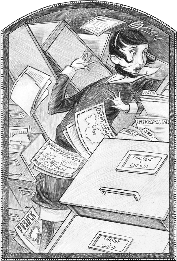 Клаус с Солнышком взглянули туда, куда показывала сестра, и увидели, что она права. Эсме толкнула один шкаф с картотекой, он повалился на следующий, а тот – на стоящий перед ним, и тяжелые металлические шкафы пошли рушиться на детей, как волна обрушивается на берег. Вайолет схватила за руки младших и потащила их прочь от падающих шкафов. Издав «кряк» и «бум», шкаф грохнулся на пол, где только что стояли дети. Трое Бодлеров с облегчением перевели дух – они были на волосок от того, чтобы оказаться раздавленными информацией о галлюциногенах[20], гельминтологии[21], глагольных рифмах и о двух сотнях иных понятий.