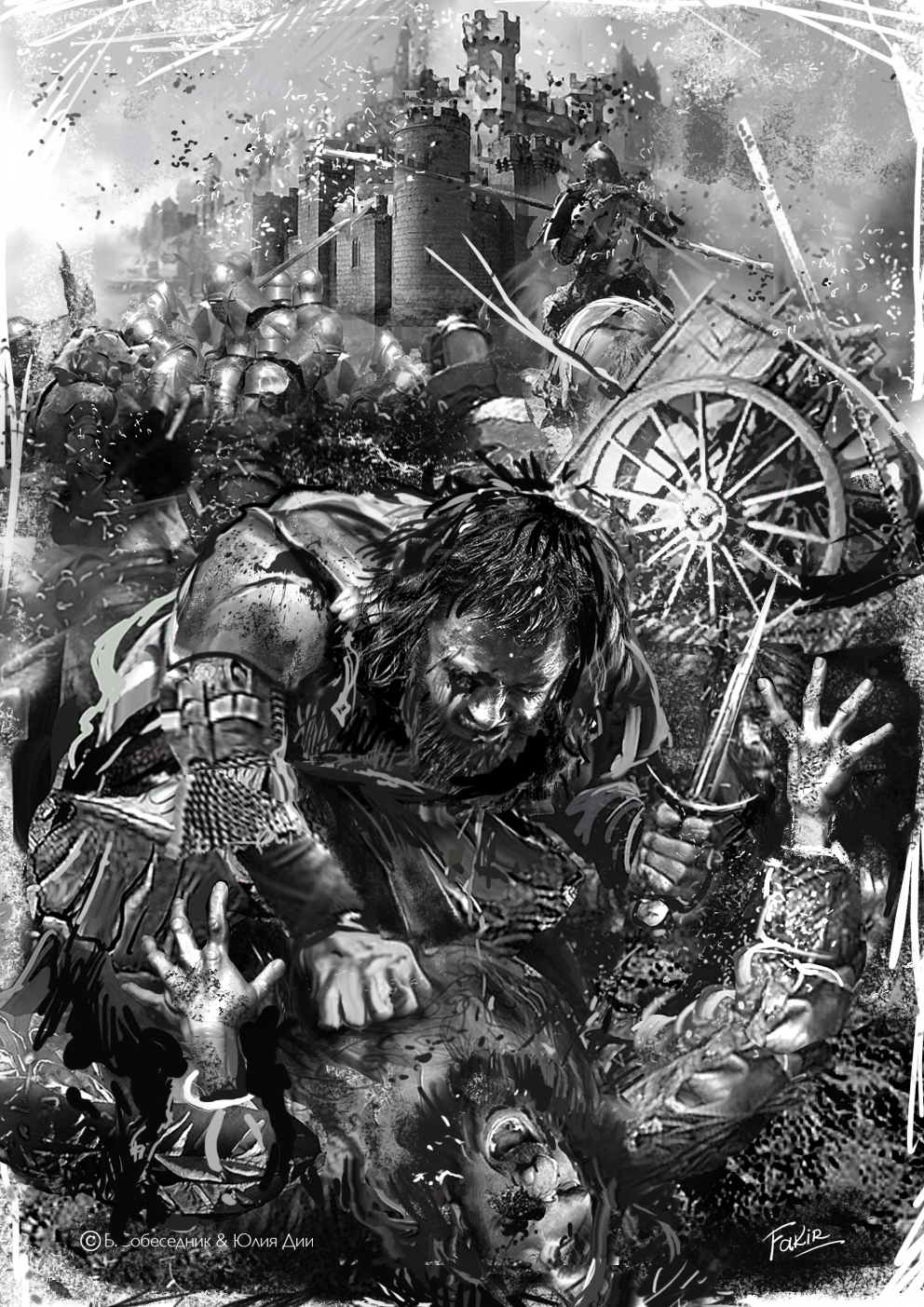 – …Довольно-таки активно там-сям посвистывали ещё смертоносные арбалетные болты, временами слышалась аркебузная трескотня и даже изредка грохотали полевые кулеврины, но всё это с некоторых пор возымело характер, скорее, бессистемный, нежели подчинялось чьей-либо железной воле. Небольшие группки опьянённых победой, вкусом крови, неутолимой жаждой убивать и грабить псов войны рыскали по изрытому, горящему, залитому кровью, устланному мёртвыми и умирающими, рыдающими, обезумевшими от нестерпимой боли телами полю, настигали и с упоением рубили на куски спасающихся бегством рассеянных солдат противника, жестоко добивали раненных и тут же беззаботно мародёрствовали. Недалече, метрах, наверное, в двухстах, может, чуть далее, французская кавалерия настойчиво пыталась затоптать довольно значительный отряд на удивление организованно отступающей кастильской пехоты. Всё безуспешно. Шпанцы свирепо огрызались, делали «ежа» и вообще вели себя вызывающе нагло, словно и не побеждённые вовсе. Промеж разбитых, утыканных пиками, рогатинами, смрадно чадящих «боевых» повозок Наварро метались осиротевшие тяжеленные бронированные рыцарские кони, сшибая, втаптывая в раскисшую луговину контуженных и ослепших. Раненный, воя обезображенным беззубым ртом, лез с мизерикордией на раненного и лишь убиенные вели себя более-менее пристойно – лежали себе, валялись, уставившись незрячими глазницами в пронзительно голубое весеннее небо. Меж тем, похоже, молва о нашей «измене» людской волной докатилась-таки до отцов-командиров. Нда-а-а-а… Шутки, судя по всему, кончились. Потому как от атакующей испанцев конницы вдруг отделился небольшой, копий эдак двадцать, отряд и бодрой, насколько позволяла захламлённая войной местность, рысью припустил в нашу сторону. Первым весьма озабоченно среагировал, как это ни странно, не рассудительный Ширяев, а извечно взбалмошный Борёк: