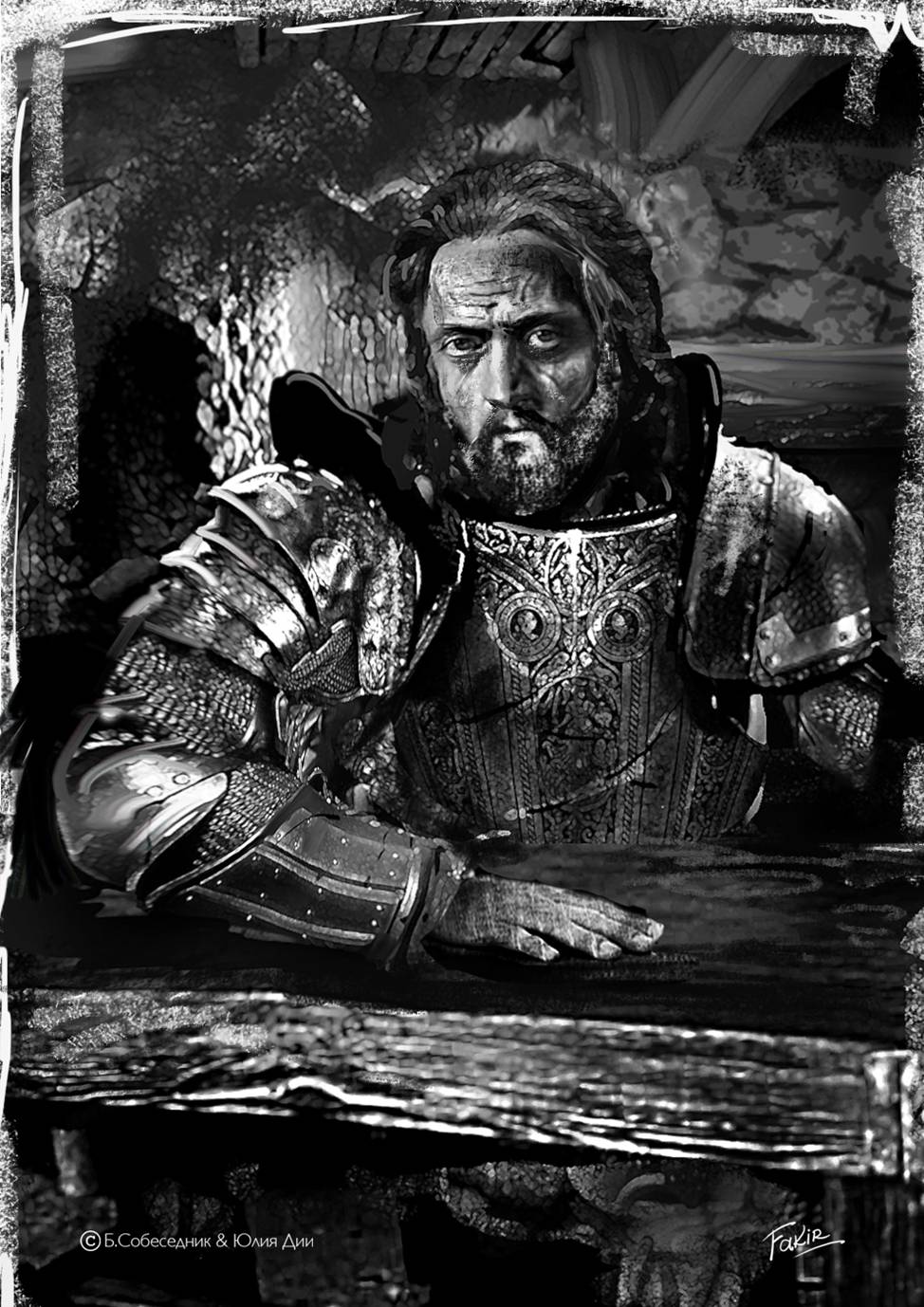 – Да, да, не смешно! Но смеяться почему-то очень хочется! Уф! – с трудом овладел собой Роланд, утирая слёзы. – Хе-хе! …В общем похож на Дворжецкого, только лицо у нашего рыцаря не такое скуластое, чуть более вытянутое, лоб пониже, глаза почти чёрные, взгляд свирепый, шрамы там всякие… Ну и губы у Владика маленько подкачали, понимаешь, форма не та.