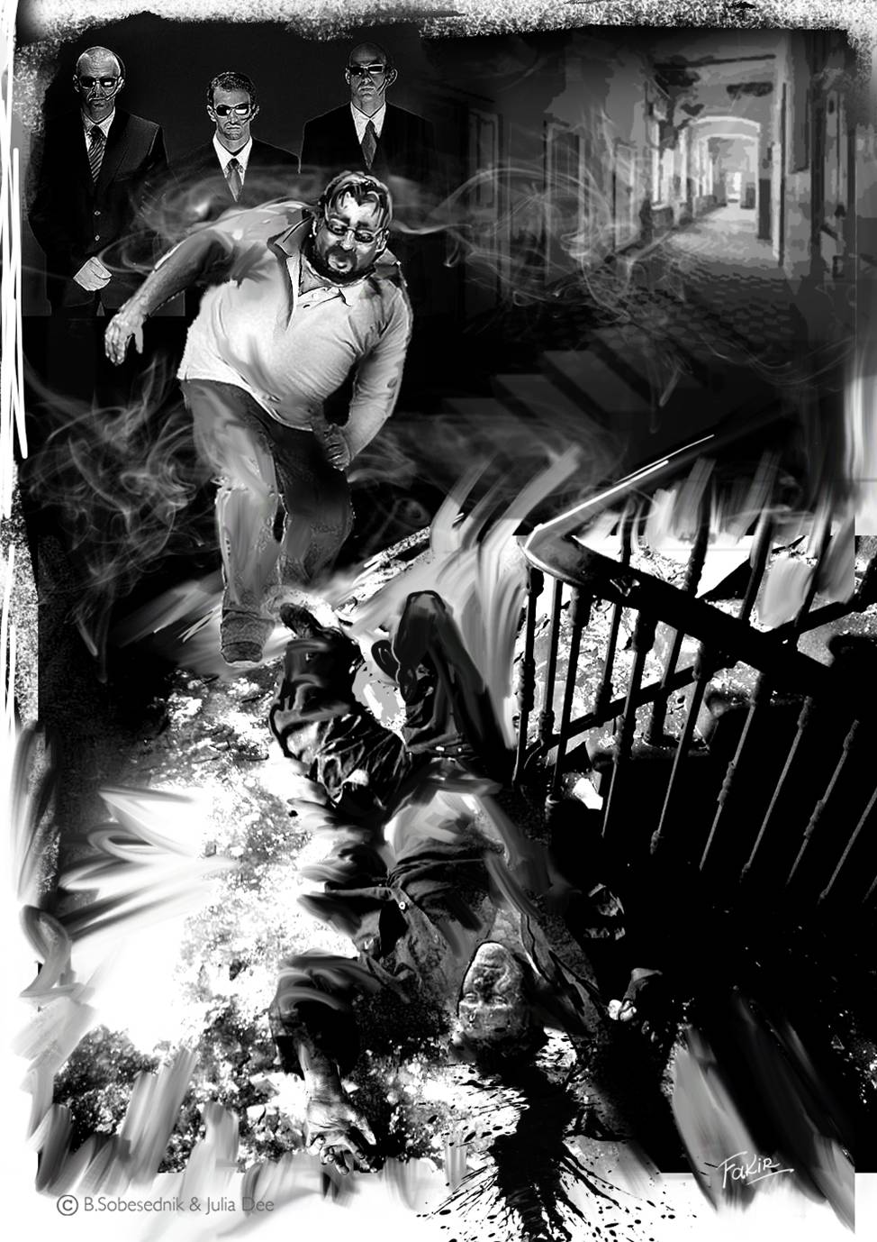 – …Только-только из машины вылез, значит, дверь не успел закрыть, уже какой-то мелкий бес в костюмчике вокруг вертится и на этом своём гундявом американском английском приглашает куда-то с ним незамедлительно пройти. Пых! Я бы, может, грешным делом и отказался, нда-а-а-а… Но тут меня быстренько взяли в оборот пара будто из-под земли выросших питекантропов с дежурными пружинками в ушах и понесли. Двое из ларца, козлы вонючие, одинаковы с лица! Да так бодро! Этот, мелкий, за нами едва поспевал!