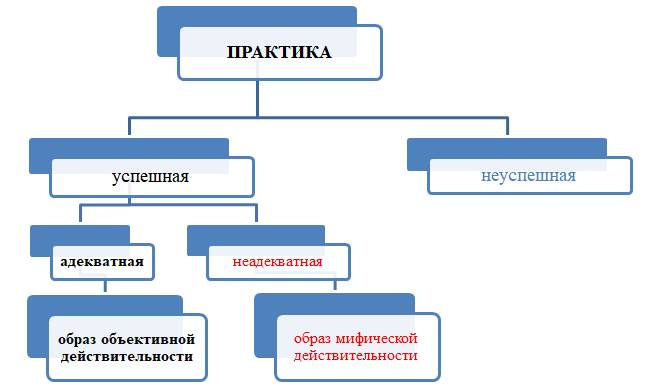 Согласно предложенной схеме, практика бывает двух видов – успешная и неуспешная, то есть приводящая к ожидаемому, запланированному итогу, либо же не приводящая к нему. Неуспешная практика не имеет развития, не идёт в потребительский обиход, поскольку не приносит желаемого результата, и, следовательно, попросту отсеивается (как индивидом, так и обществом в целом, иными словами, всякой познающей системой). Развитие получает только практика успешная, то есть та, что приводит к ожидаемому результату, который был желаем. Но успешная практика, в свою очередь, как и практика вообще, также делится на два вида – на практику успешную и при этом адекватную и на практику успешную, но при этом неадекватную. Вот именно в этом делении (на адекватную и неадекватную практики) и кроется вся важность раскрываемых здесь понятий, поскольку именно в нём проводится водораздел в познании, приводящем к формированию образа действительности объективной и образа действительности мифической. Как уже указывалось, адекватная практика – это та практика, что содержит в себе только существенные действия по отношению к преобразованию действительности, вследствие чего и приводит к формированию образа объективной действительности во всех её существенных характеристиках. Неадекватная же практика – это практика, содержащая в себе, помимо существенных, достаточных для достижения цели, действий, также действия и несущественные, лишние, потому такая практика и формирует образ неадекватной, мифической действительности, поскольку в ней существенные стороны перемешаны с несущественными.