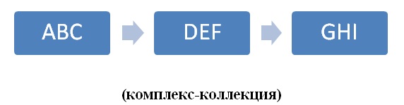 Следующая фаза развития мышления ребёнка – это образование так называемых комплексов-коллекций. В эксперименте к исходному элементу с признаками ABC ребёнок стремится добавить элементы с признаками DEF и GHI и т.д.