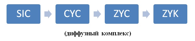 Схематически фазу диффузного комплекса можно обозначить близко тому, как обозначается предыдущая фаза цепного комплекса, но с некоторым отличием: