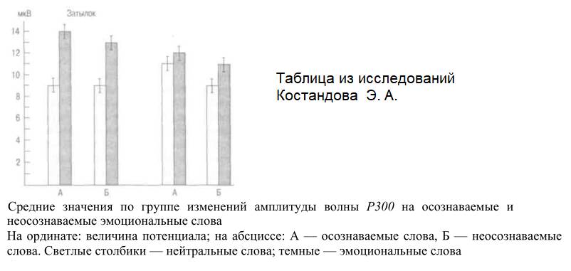 Один из наиболее маститых психофизиологов СССР и нынешней России Костандов Эдуард Арутюнович (главный научный сотрудник Лаборатории нейрофизиологии когнитивных процессов Института высшей нервной деятельности и нейрофизиологии РАН) сообщает об исследованиях, в которых также измерялась реакция на эмоционально значимые для субъекта слова, но уже в ключе его индивидуального опыта (Костандов, 2004. С. 29).