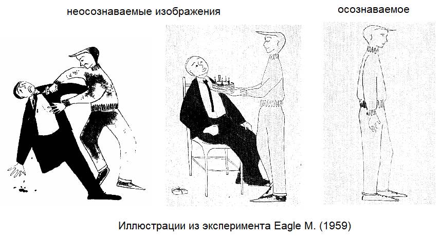 В другом эксперименте (Eagle, 1959) двум группам испытуемых в сверхбыстром режиме предъявлялись два разных изображения. Одной группе демонстрировалась картинка, на которой подросток угощает человека тортом, а другой группе – картинка, где тот же подросток бьёт этого человека ножом. Продемонстрированные в сверхбыстром режиме эти изображения не успевали осознаваться испытуемыми. Но, несмотря на факт неосознания, эти изображения всё же влияли на отношение испытуемых к предъявленной дальше третьей картинке – на которой этот же подросток был изображён спокойно стоящим, то есть в нейтральном контексте. Эта картинка предъявлялась в нормальном режиме, вполне достаточном для осознания с целью получения характеристики личности изображённого подростка. В итоге люди из той группы, которая изначально в сверхбыстром неосознаваемом режиме видела этого подростка, вручающего человеку торт, оценили его положительно, а люди из второй группы, которая видела перед этим неосознаваемое изображение подростка, наносящего человеку удар ножом, оценили его отрицательно.