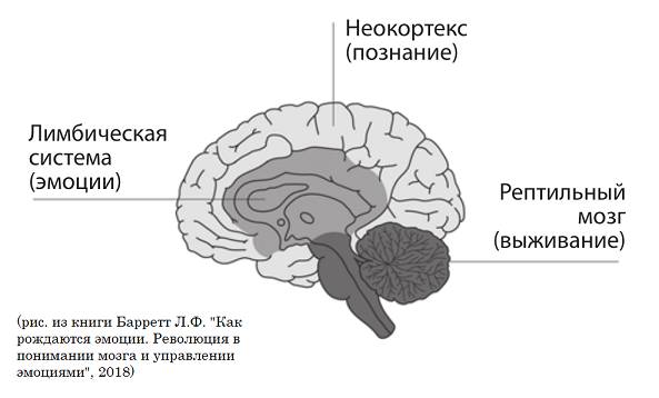 В 1960-х нейробиолог Пол Маклин (Paul D. MacLean) предложил концепцию "триединого мозга", суть которой сводилась к тому, что мозг человека представляет своеобразную матрёшку из трёх различных по возрасту структур: кора мозга (неокортекс) – наиболее молодое эволюционное образование, где осуществляются сложные мыслительные процессы; кора покрывает лимбическую систему – более древнее образование, отвечающее за эмоции; а лимбическая система, в свою очередь, покрывает древнейшую из структур мозга, которую Маклин назвал "рептильным мозгом", подразумевая, что этот самый "рептильный мозг" (ствол мозга, базальные ганглии и другие структуры) возник ещё сотни миллионов лет назад у рептилий и оказывается общим для всех последующих эволюционных видов. В "рептильном мозге" Маклин разместил все возможные инстинкты (Марцинковская и др., с. 141). Якобы вся эта концепция должна была объяснить, почему человек может думать одно, чувствовать другое, а делать и вовсе третье.
