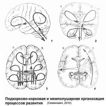 На рисунке выше представлена хронология развития мозга: снизу вверх (от ствола через подкорку к коре), справа налево (сначала правое полушарие, потом левое), от задних отделов к передним, и затем уже от передних отделов коры обратно вниз – к подкорке.