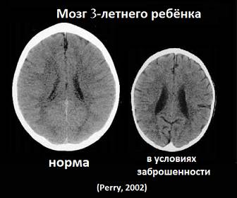 Что важно, чем раньше удастся выдернуть ребёнка из неблагоприятной среды и погрузить в условия нормального развития, тем значительнее будет восстановление мозговых структур и соответствующих психических функций (Perry, 2002).