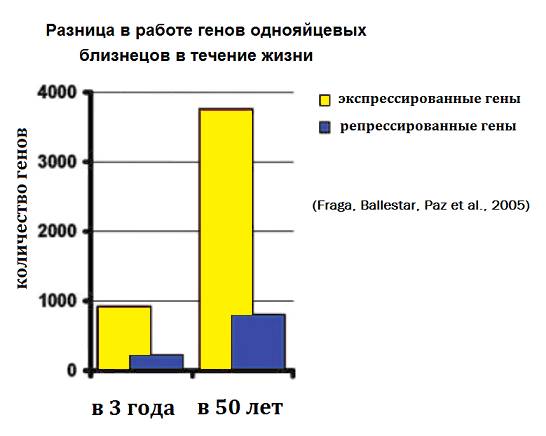 Даже в работе генов однояйцевых близнецов (имеющих совершенно одинаковый генотип) с возрастом наблюдаются существенные различия – к 50 годам эта разница может быть четырёхкратной (Fraga, Ballestar, Paz, et al., 2005).