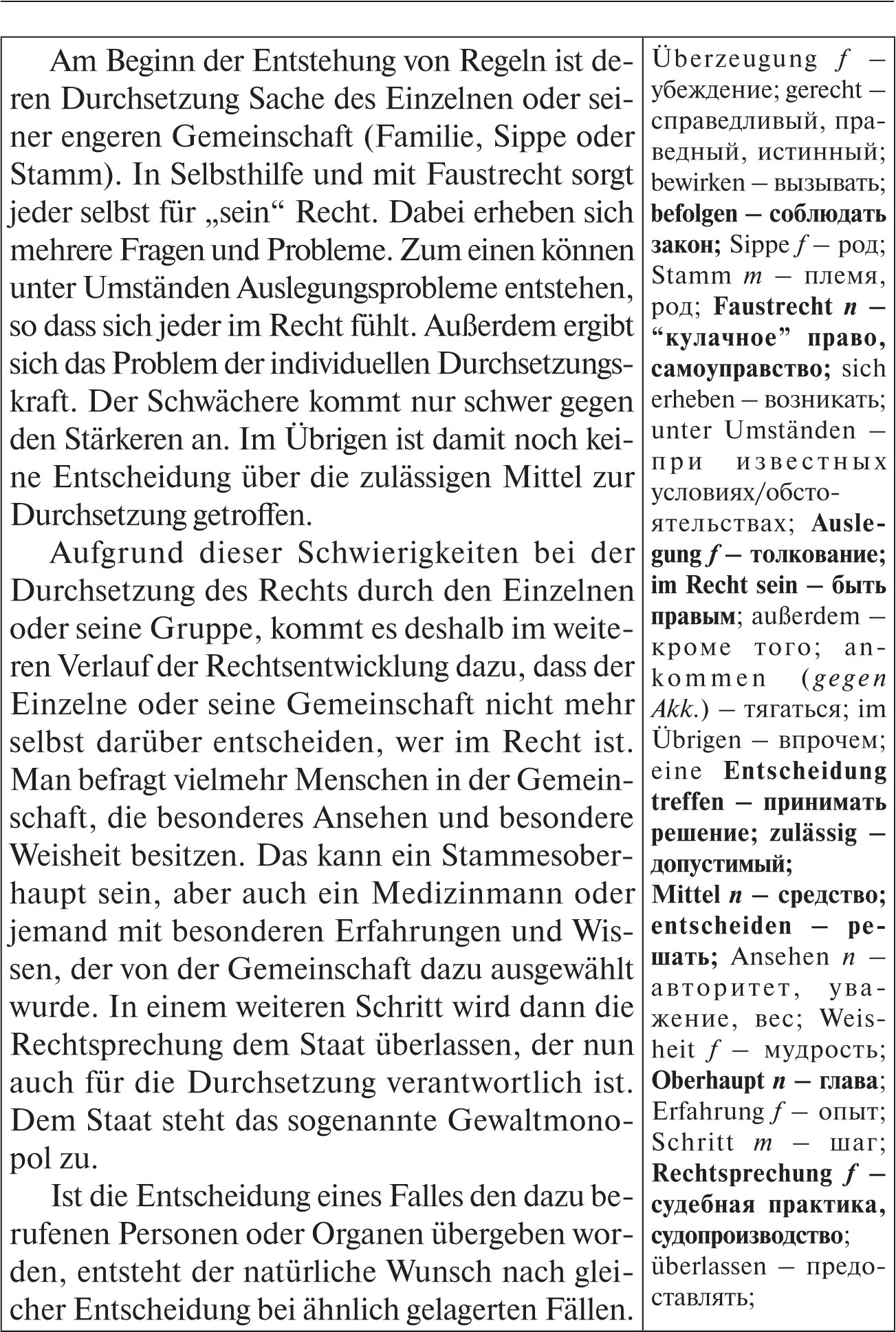 Durchsetzung von Rechtsregeln● Die Durchsetzung von Recht ist zunächst dem Einzelnen oder der Gruppe, der er angehört, überlassen. Dann entwickeln sich besondere Verfahren für die Rechtsprechung und die Durchsetzung des Rechts. Schließlich werden diese Aufgaben dem Staat übertragen, der nun allein dafür zuständig ist: Gewaltmonopol des Staates.
