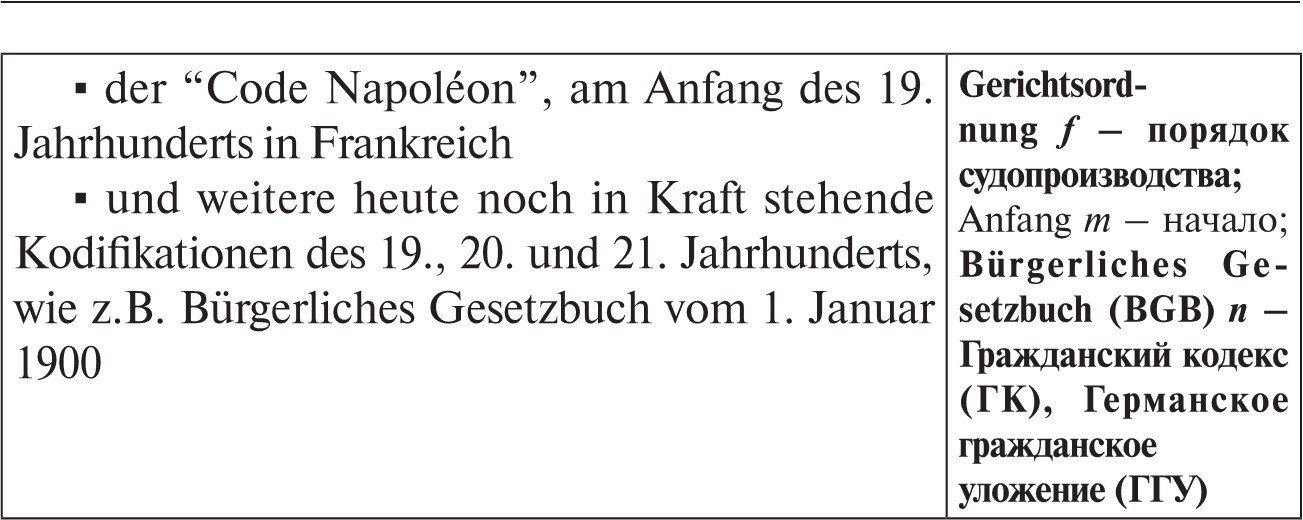 * * *Grundgesetz (GG) n – Основной закон (название конституции ФРГ); Bundes-Verfassungsgesetz (B-VG) n ≈ Конституция Австрии; Bürgerliches Gesetzbuch (BGB) n – Гражданский кодекс ФРГ, Германское гражданское уложение (ГГУ); Allgemeines Bürgerliches Gesetzbuch (ABGB) n – Гражданский кодекс Австрии, Австрийское гражданское уложение; Zivilprozessordnung (ZPO) f – гражданский процессуальный кодекс; Strafgesetzbuch (StGB) n – уголовный кодекс; Strafprozessordnung (StPO) f – уголовно-процессуальный кодекс;