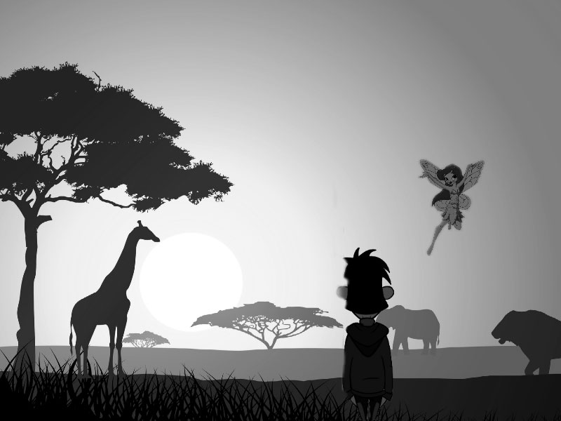 Сделав пару шагов, Коля ахнул, когда увидел, какой перед ним открылся удивительный вид. Он очутился в африканской саванне. Впереди виднелись редкие деревья, вдалеке сквозь высокую траву величавой поступью шли слоны, встречая слегка встревоженные взгляды пятнистых жирафов. Справа был огромное озеро, где в воде купались ярко-розовые фламинго, спасаясь от дневного африканского зноя. Фея привела Колю к огромному дереву с пышной кроной.