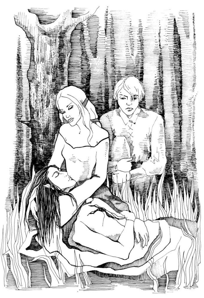 Песнь леса превратилась в пронзительный плач! Деревья ворчливо зашевелили ветвями, отбивая монотонный ритм. Светлячки окутали Ребекку, Годфри и мертвого эльфа мерцающим туманом, взметнувшись вихрем к темному звездному небу. Лунные лучи озарили лицо Нейвиса мраморными бликами. Высокие стебли зашевелились и подобно змеям стали обвивать остывшее тело. Златовласка, словно впала в транс, продолжая петь. Мигающие искры закружили в воздухе, обгоняя в полете светящихся насекомых, и стремясь за ними к своду небес.