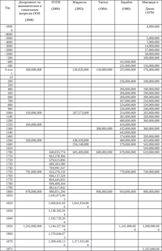 В таблице 2 представлены оценки народонаселения различными авторами в конце прошлого и начале нынешнего века, а также официальные данные ООН.