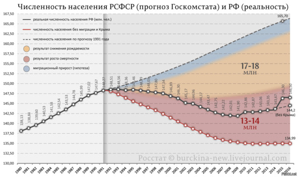 Рисунок 62. Численность населения в России (прогнозируемая в советский период и фактическая)