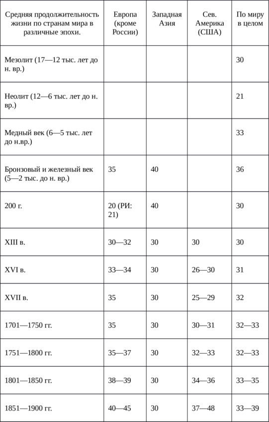 Таблица 3. Изменения средней продолжительности жизни в мире и в некоторых регионах с древнейших времен до наших дней