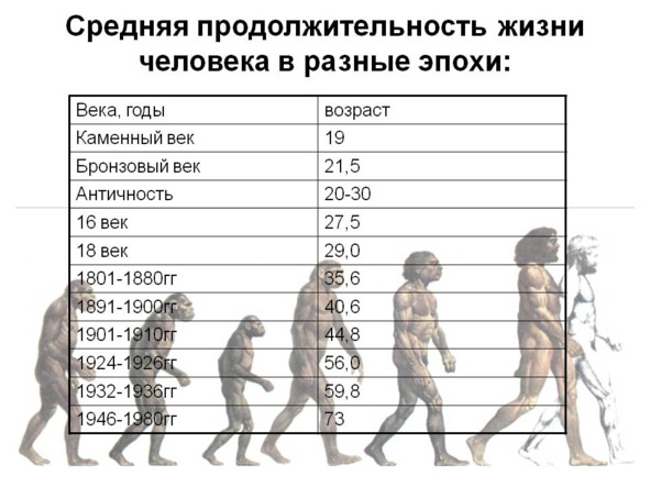 Рисунок 64. Средняя продолжительность жизни человека в разные эпохи (на взгляд автора, неудачная иллюстрация, изображающая естественную эволюцию человека, начавшуюся задолго до каменного века)