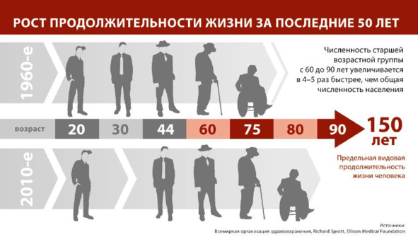 На рисунке 65 показан наблюдаемый рост продолжительности жизни людей с преобладанием численности старшей возрастной группы, которая растет в 4—5 раз быстрее, чем общая численность населения (старение населения) за последние 50 лет, представленный ВОЗ. Делается вывод и о принципиальной возможности достижения в будущем предельного возраста в 150 лет (хотя многие эксперты предполагают более скромные 120 лет).