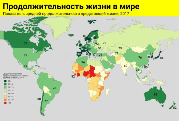 Наиболее высокие показатели характерны для стран Западной Европы, Японии, Южной Кореи, Австралии и Новой Зеландии, Канады и Чили. Низкие показатели (60 и менее лет) характерны для большинства стран Африки. Многие страны Азии и Океании характеризуются СПЖ менее 65 лет. Экспертами такое положение вещей увязывается с низким уровнем жизни населения, сопровождающимся распространенностью инфекционных заболеваний, голоданием населения, в том числе в детском возрасте. Весьма интересно сравнение наблюдаемого распределения СПЖ с рождаемостью (как вторым фактором, определяющим численность населения).