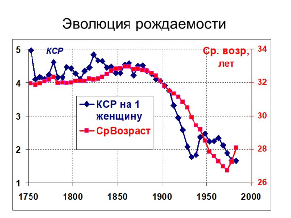 В связи с этим мы можем высказать гипотезу об их взаимообусловленности, которая может иметь фундаментальный характер. Для формулирования гипотезы нам следует проследить изменение рождаемости и сравнить ее со средней продолжительностью жизни как минимум за период наблюдений, т. е. с середины XVIII века.