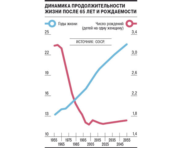 Рисунок 69. Динамика продолжительности жизни после 65 лет и рождаемости (по данным ООН)