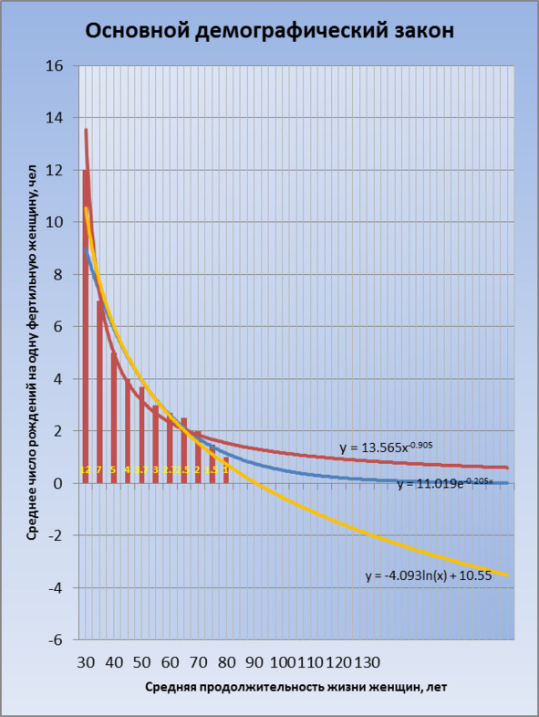 Именно поэтому нас заинтересовала зависимость среднего числа рождений на одну фертильную женщину [233] от средней продолжительности жизни женщин (это не снижает роли мужчин в воспроизводстве населения). Мы исследовали все периоды от мезолита [234] до наших дней, справедливо полагая, что среднее число рождений на одну женщину до XVIII века, скорее всего, не превышало 12 единиц. Предлагаемое умопостроение реализовано на диаграмме, которую мы назвали основным демографическим законом.