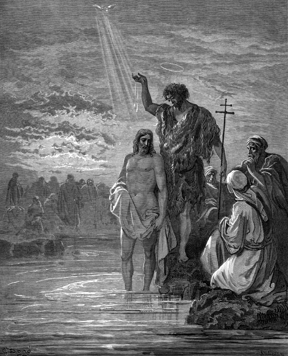 Когда Иисус вошел в реку, Иоанн положил свои руки на голову Спасителя, и Он окунулся в воду. Когда Иисус вышел из воды, над Ним раскрылось Небо, на Него спустился в виде белого голубя Дух Святой, и слышен был с Неба голос Бога Отца: «Это Сын Мой возлюбленный, в Котором все Мое благоволение».