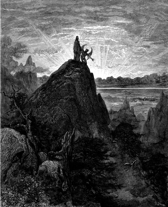 Наконец дьявол завел Иисуса на высокую-высокую гору. Оттуда далеко видны были и города, и деревни, и зеленые луга, и темные леса, и желтеющие спелым хлебом поля, и синее море. С этой горы дьявол показал Иисусу Христу, как на картине, все царства мира и сказал: «Все это дам Тебе, если Ты мне поклонишься». Дьявол хвастает и хочет обмануть Иисуса. Мы все во власти Божьей, и Бог над всеми царствует, а не дьявол. Как же он может другому дать то, чего не имеет сам?