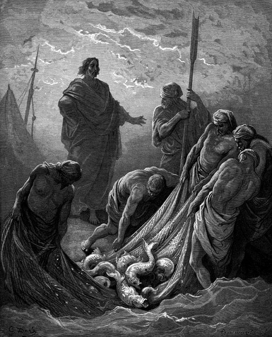 «Не бойся, – сказал ему Иисус Христос, – с этого времени ты будешь ловить людей. Ты будешь Моим учеником, будешь учить людей, как нужно жить, чтобы попасть в царство небесное. Как рыбаки вытаскивают рыбу из воды и вынимают ее из сети, так и ты будешь вытаскивать грешных из глубины греха и пороков, будешь учить их и уговаривать сделаться добрыми, и как рыбаки пойманную рыбу несут к хозяину, так и ты будешь приводить ко Мне людей».