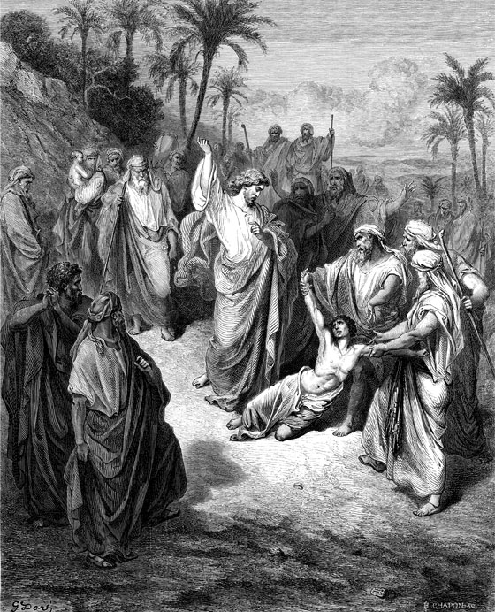 Когда Иисус Христос с Петром, Иаковом и Иоанном были на горе Фавор, остальные ученики оставались внизу. Туда собралось множество людей с больными и безумными. Как только Иисус Христос сошел с горы, к Нему подошел человек и, став перед ним на колени, сказал: «Учитель! Господи! Сжалься над моим единственным сыном. Он одержим злым духом, и каждый месяц с ним случаются приступы безумия. Злой дух так хватает его, что он вскрикивает; мучает его так, что у него на губах появляется пена и он обмирает. Злой дух покидает его только тогда, когда достаточно измучит. Я просил Твоих учеников, чтобы они изгнали злого духа, но они не смогли вылечить моего сына».