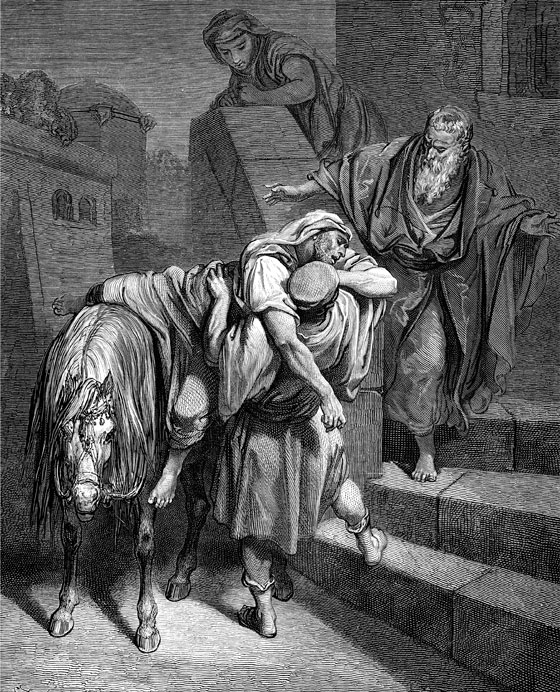 Законник опять спрашивает: «А кто мой ближний?» На это Иисус Христос рассказал вот какую историю. Один человек шел из Иерусалима в Иерихон (Иерихон – это город. Из Иерусалима в Иерихон идти нужно было через пустыню, в которой жили разбойники). И попался этот человек в руки разбойников, которые сняли с него одежду, избили его и ушли, оставив на дороге еле живого. По этой же дороге довелось идти священнику. Он, увидев ограбленного и избитого человека, прошел мимо. То же самое сделал и другой прохожий, левит (служитель храма). По этой же дороге ехал один самарянин (а вы помните, что евреи и самаряне терпеть друг друга не могли). Увидел он несчастного человека и сжалился над ним. Он подошел, перевязал ему раны, обтер его маслом и вином, потом посадил на своего осла, привез в гостиницу и стал ухаживать за ним. На другой день, уезжая, самарянин дал хозяину гостиницы два динария (две монеты) и попросил позаботиться о бедном человеке, а если хозяин истратит больше денег, то самарянин обещал вернуть долг на обратном пути.