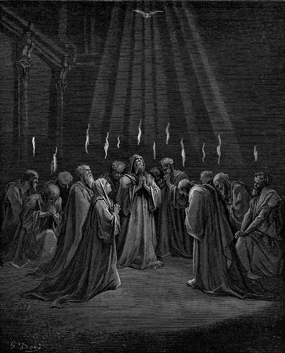 На пятидесятый день после воскресения Господа и на десятый после Его вознесения Божья Матерь и апостолы собрались утром в своей комнатке при храме и молились Богу. Вдруг с Неба послышался шум (это случилось в третьем часу по еврейскому счету времени, а по нашему – в девятом часу утра), будто поднялась страшная буря с вихрем, который ворвался в самую комнату. Над апостолами появились огненные языки, которые опустились на их головы (по одному языку на каждого). Это и был Святой Дух, сошедший в виде огненных языков.