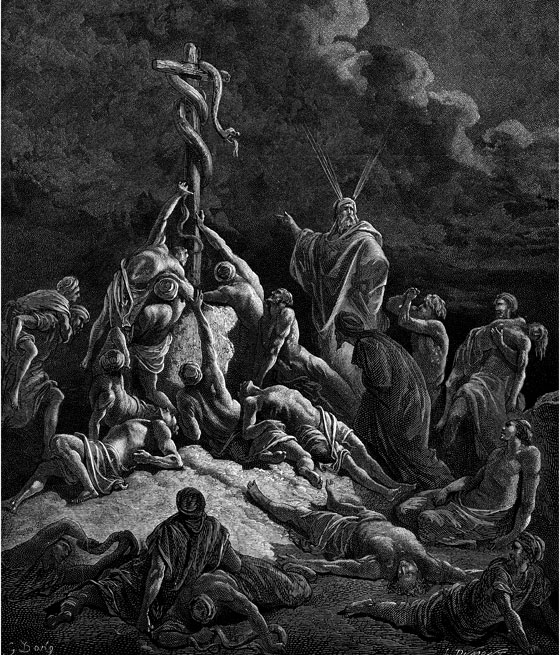 Высоко над безбрежной пустынеюПеленой ослепительно синеюРасстилается неба полдневного свод.Впереди – лишь пески распаленные…И поникли главой утомленные,Возроптал иудейский народ.К Моисею пришли недовольные.«Для того ли – рабы подневольные –Из Египта мы шли за тобой,Чтоб завел нас в пустыни бесплодные,Где теперь погибаем, голодные,Где томят нас и жажда, и зной?»И Господь, наделивший их манною,Им сиявший над степью песчаною,Прогневясь на роптавших, послалЗмей-сарафов – и многих в ИзраилеЯдовитые змеи ужалили,И без счета народ погибал.И, явясь к Моисею в смятении,Вновь молили они о прощении;И Всевышнего он умолил:Змия медного, им изваянного,Пред очами народа избранногоВысоко Моисей водрузил.Истомленные тяжким страданием,Поднимались к нему с упованиемУгасавшие взоры людей.Кто бы ни был из сонмища бедного,Всякий, змия увидевши медного,Исцелялся от боли своей.О. Н. ЧюминаЧудесная переправа