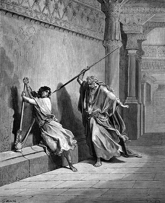А злой дух все больше и больше мучил Саула: редко он бывал спокоен и весел, все больше тосковал и сердился, Давида же ненавидел все сильнее. И вот однажды ночью, когда Давид играл перед Саулом, царь схватил копье и бросил в музыканта. Давид успел отскочить, и копье воткнулось в стену.