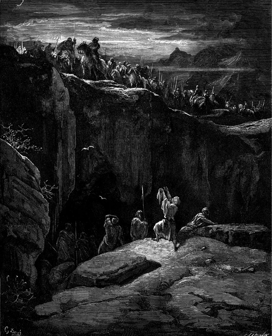 Вот этот-то великан и силач спускался с горы в долину и, насмехаясь над евреями, своим грубым, хриплым голосом громко кричал им: «Кто из вас осмелится прийти сюда и сразиться со мной? Если среди вас найдется такой смельчак, который победит меня, филистимляне станут рабами евреев; если же я убью его, евреи будут рабами филистимлян». Он проделывал это каждый день – утром и вечером – в течение сорока дней.
