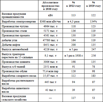 Для наглядности успехи развития страны в 1930 году в абсолютных цифрах и сравнениях их с 1913 годом в %, а также производство в 1930 году в сравнении с 1929 годом в %, т. е. за один год показаны в нижеприведенной таблице.