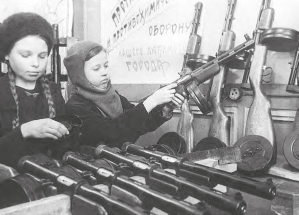 Девочки-подростки Нина Николаева и Валя Волкова на сборке автоматов ППД на заводе имени С. П. Воскова в блокадном Ленинграде. 1943 год