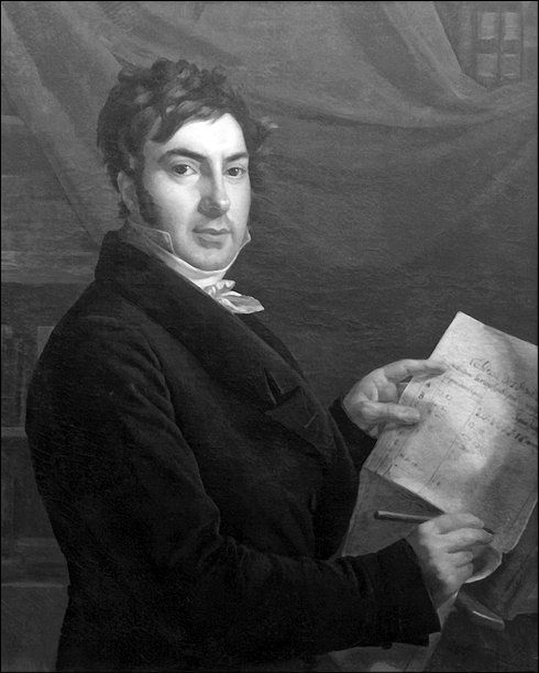 Жан-Франсуа Шампольон держит в руках свой алфавит фонетических иероглифических знаков. Портрет 1823 г.