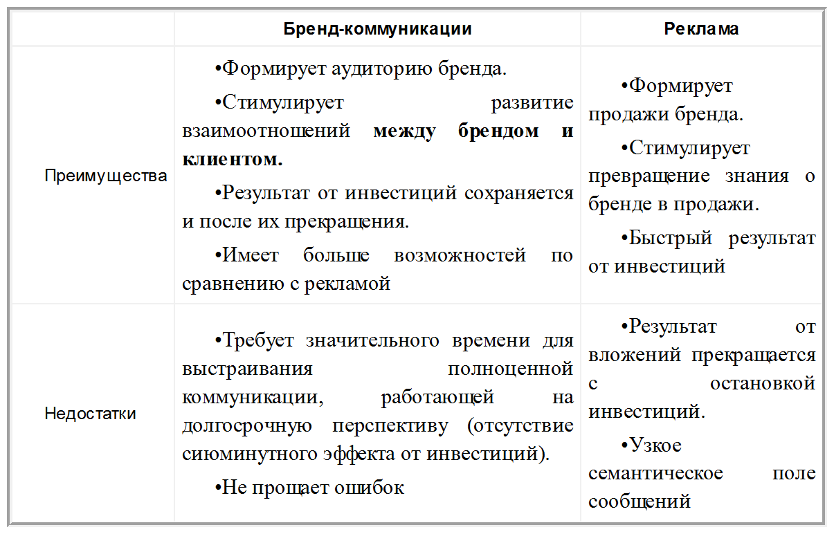 Таблица 1. Разница между бренд-коммуникациями и рекламой, не опирающейся на бренд