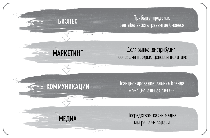 Рассмотрим пример. Группа компаний готовится к выходу на IPO[7]. Их бизнес-задача – привлечение дополнительных инвестиций. Тогда маркетинговой задачей будет повышение репутационной капитализации бренда. Проистекающие из нее коммуникационные задачи: выстраивание слаженной эффективной работы с подразделениями бизнес-единиц холдинга, объединение, сплочение группы компаний под единым брендом, создание и распространение имиджа холдинга как лидера и надежного партнера в своей рыночной нише. Далее на основе коммуникационных задач ставятся медиазадачи: обеспечить максимальную долю голоса (SOV) на национальном телевидении в своей категории, повысить осведомленность о бренде среди 80 % аудитории в отраслевых СМИ[8]. Такое взаимодействие между всеми элементами пирамиды бизнеса является оптимальным с точки зрения интересов компании. Это можно сравнить с оркестром, в котором слаженная игра каждого инструмента производит неизгладимое впечатление на слушателей.