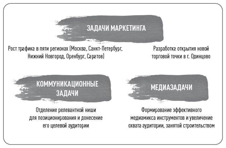 Кейс 1 (рис. 4) – международная сеть строительных магазинов. Перед бизнесом стояли задачи по расширению в Московской области и увеличению прибыли в пяти крупных городах России, где уже работали магазины сети. Отделом маркетинга было решено увеличить трафик в магазинах Москвы, Нижнего Новгорода, Оренбурга, Санкт-Петербурга и Саратова, а также разработать стратегию открытия нового магазина в городе Одинцово в сентябре 2016 года. Коммуникационные задачи, основанные на маркетинговых, коротко можно сформулировать так: определить релевантную нишу для позиционирования бренда и донести его до целевой аудитории. Медиазадачи, исходя из целей, поставленных коммуникациями, были следующими: формирование эффективного медиамикса инструментов и увеличение охвата аудитории, занятой строительством.