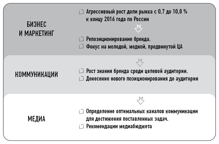 Кейс 2 (рис. 5): отечественный производитель чипсов поставил цель – агрессивный рост доли на российском рынке с 0,7 до 10,0 % к концу года. Маркетологи компании предложили репозиционировать бренд и переориентироваться на молодую, модную и более продвинутую аудиторию, исходя из их более высокой покупательной способности и лояльного отношения к фастфуду и снекам. Коммуникации переняли эстафету, поставив следующие задачи, основанные на маркетинговых целях: рост знания о бренде среди новой целевой аудитории, информирование о новом имидже продукта. Исходя из задач коммуникаций, медиа должны были определить оптимальные каналы коммуникации для достижения поставленных задач, то есть максимального охвата аудитории, а также рекомендовать оптимальный медиабюджет.